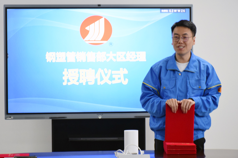 4月1日下午,91免费版污下载管道举行了钢塑管销售部大区经理授聘仪式,卢建斌、李建庆2位同志经过报名、资格审查、竞聘演讲、综合评议等环节,成功竞聘为钢塑管销售部大区经理,喜从孙进峰董事长手中接受聘书,竞聘人员都收到了孙董亲笔书写的寄语。